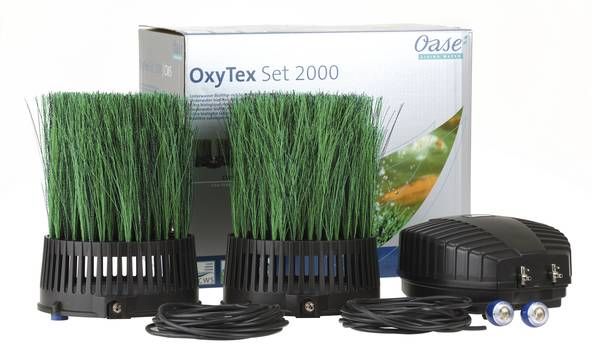 - - De OxyTex Set 2000 bestaat uit een OxyTex 1000 en een sterke AquaOxy 2000 vijverbeluchtingspomp.